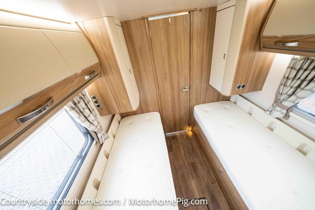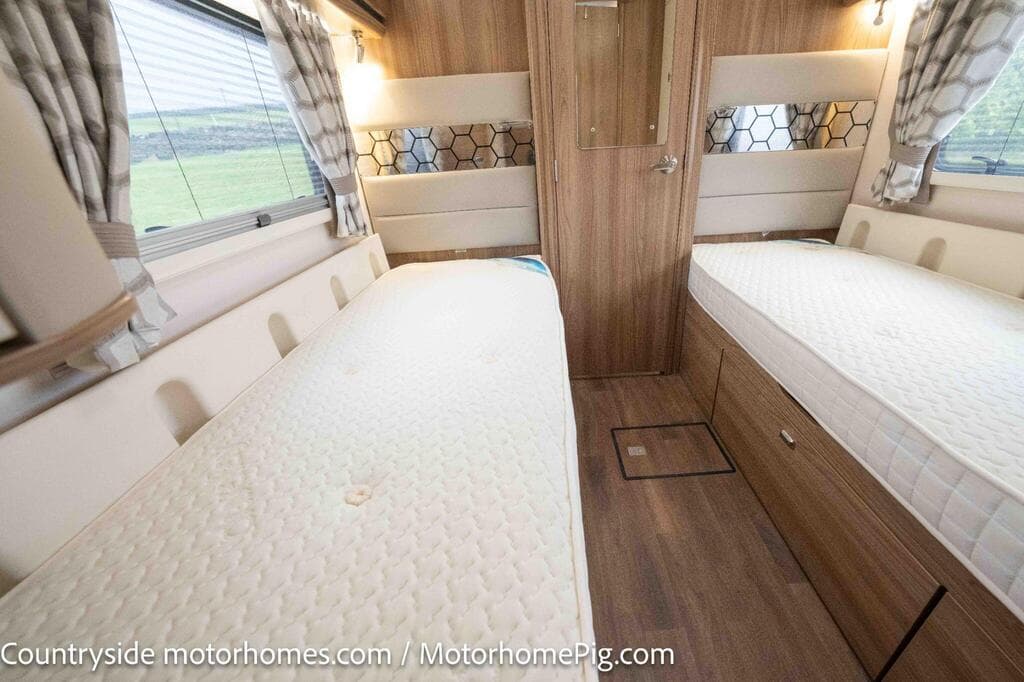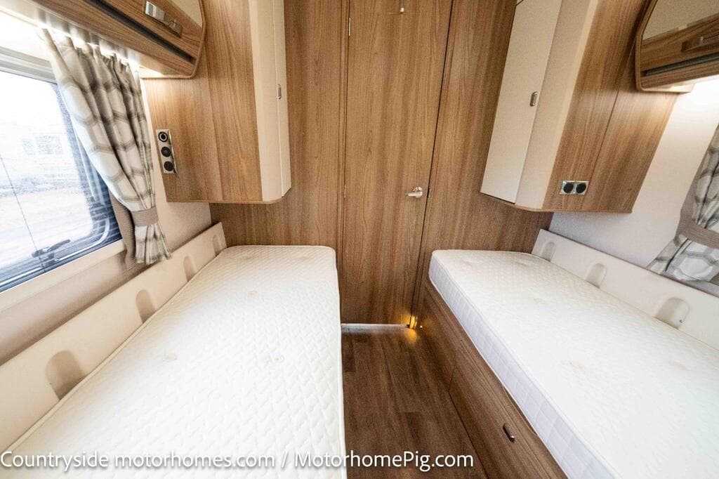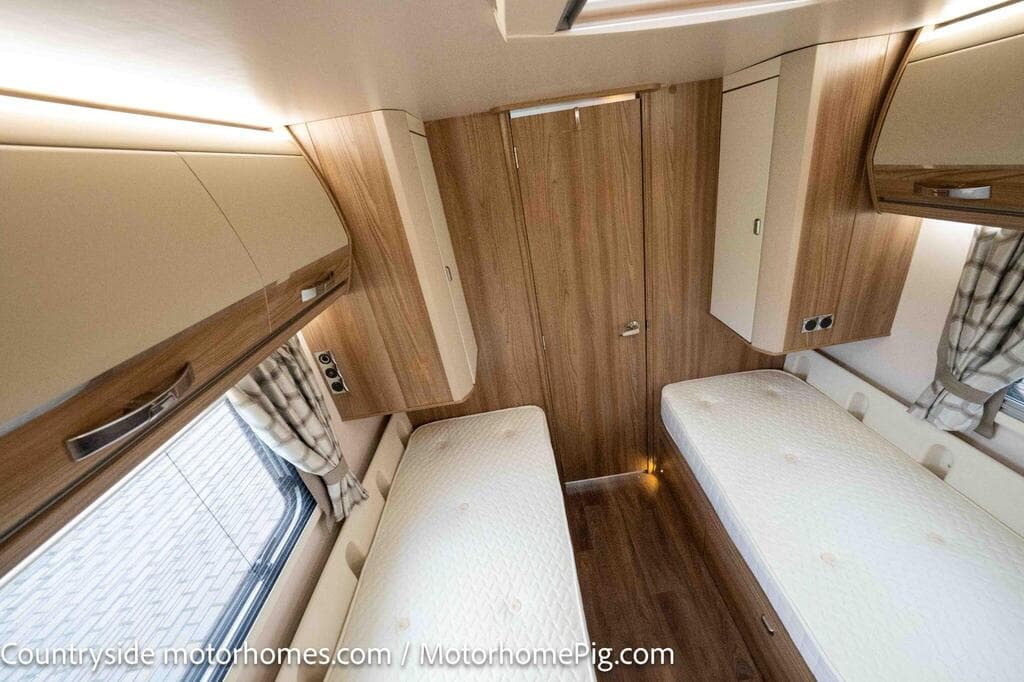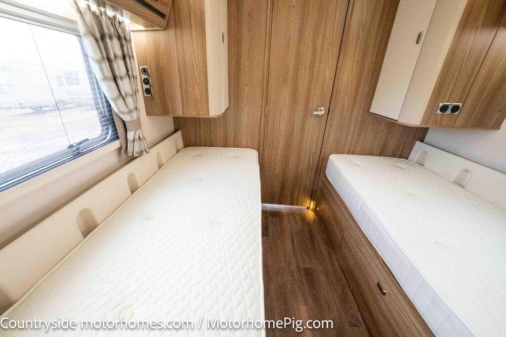- 2 fixed single beds with privacy door separating bedroom from kitchen/lounge